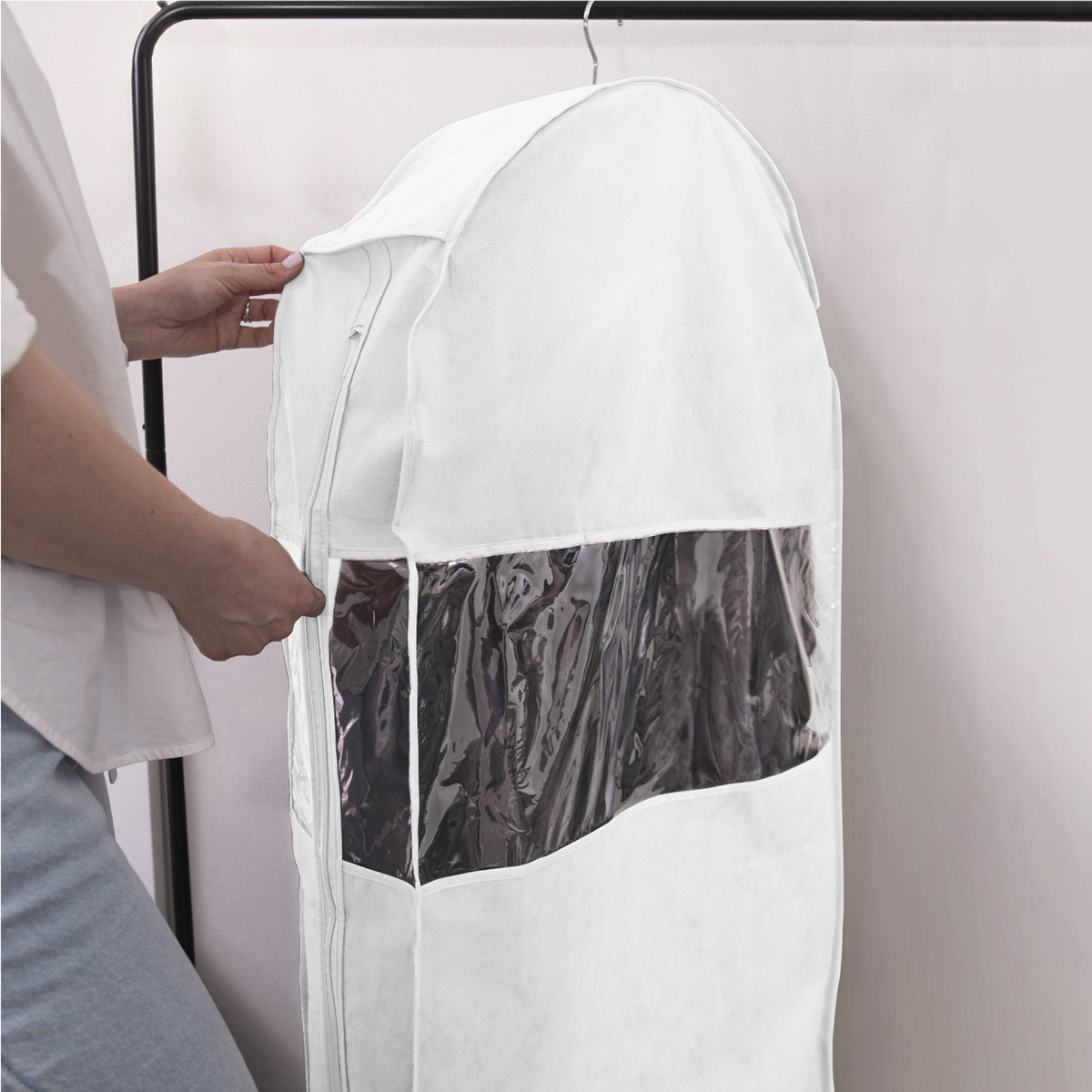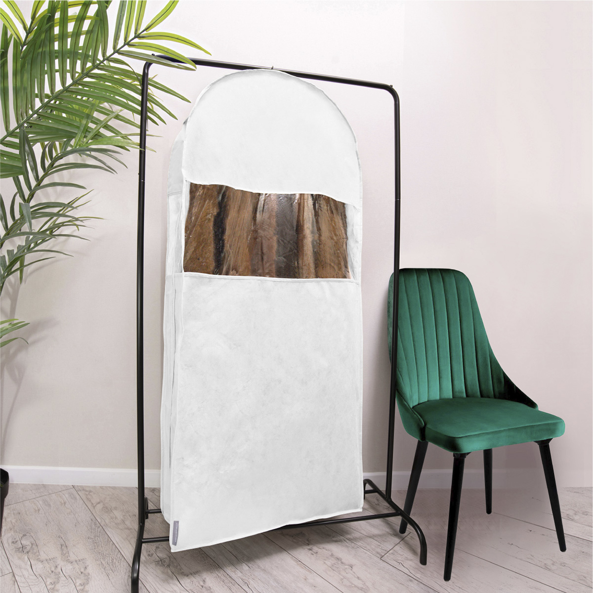 Верхняя пластиковая вставка защищает воротник от заломов, а узкое отверстие для вешалки предотвращает попадание пыли и насекомых. Дышащий материал спанбонд пропускает воздух, оберегая мех от пересыхания и солнечного света. Сбоку расположена удобная молния, а прозрачная вставка позволяет увидеть, что внутри, не открывая чехол.