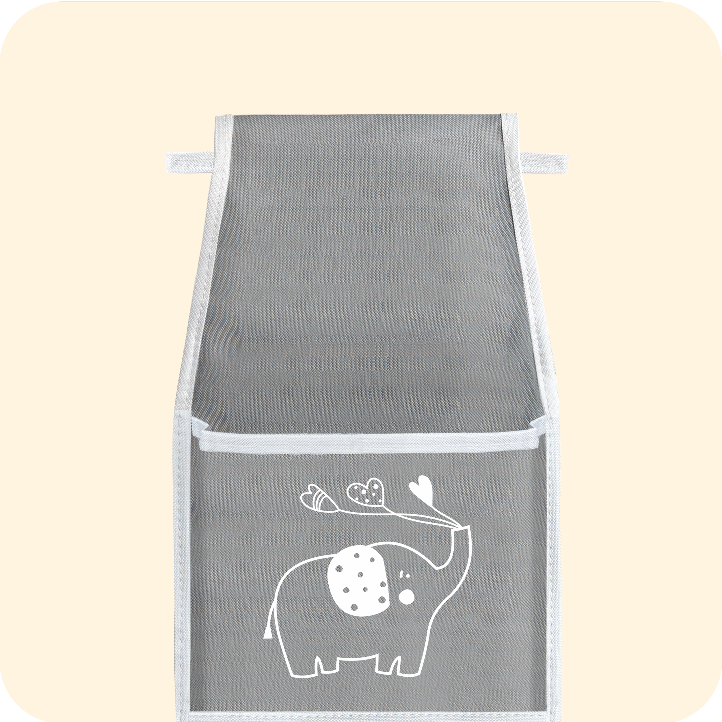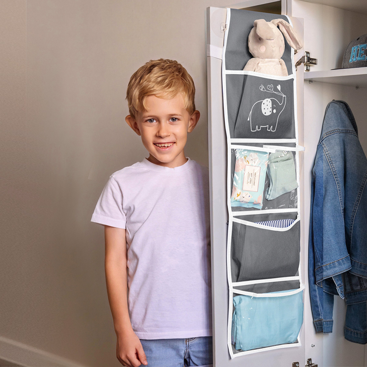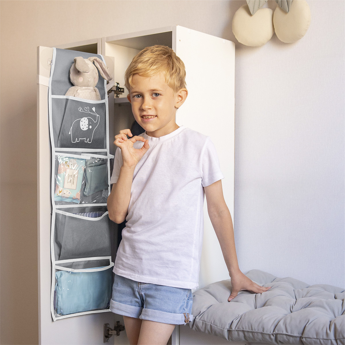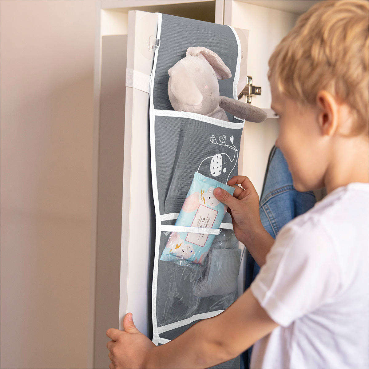 Пять отделений (два тканевых и три прозрачных) вмещают одежду, сменку и аксессуары. Кармашек крепится с помощью перекидного клапана на резинке или петель — можно повесить на крючки (крючки не входят в комплект). Снаружи — прозрачный карман для фото или имени.