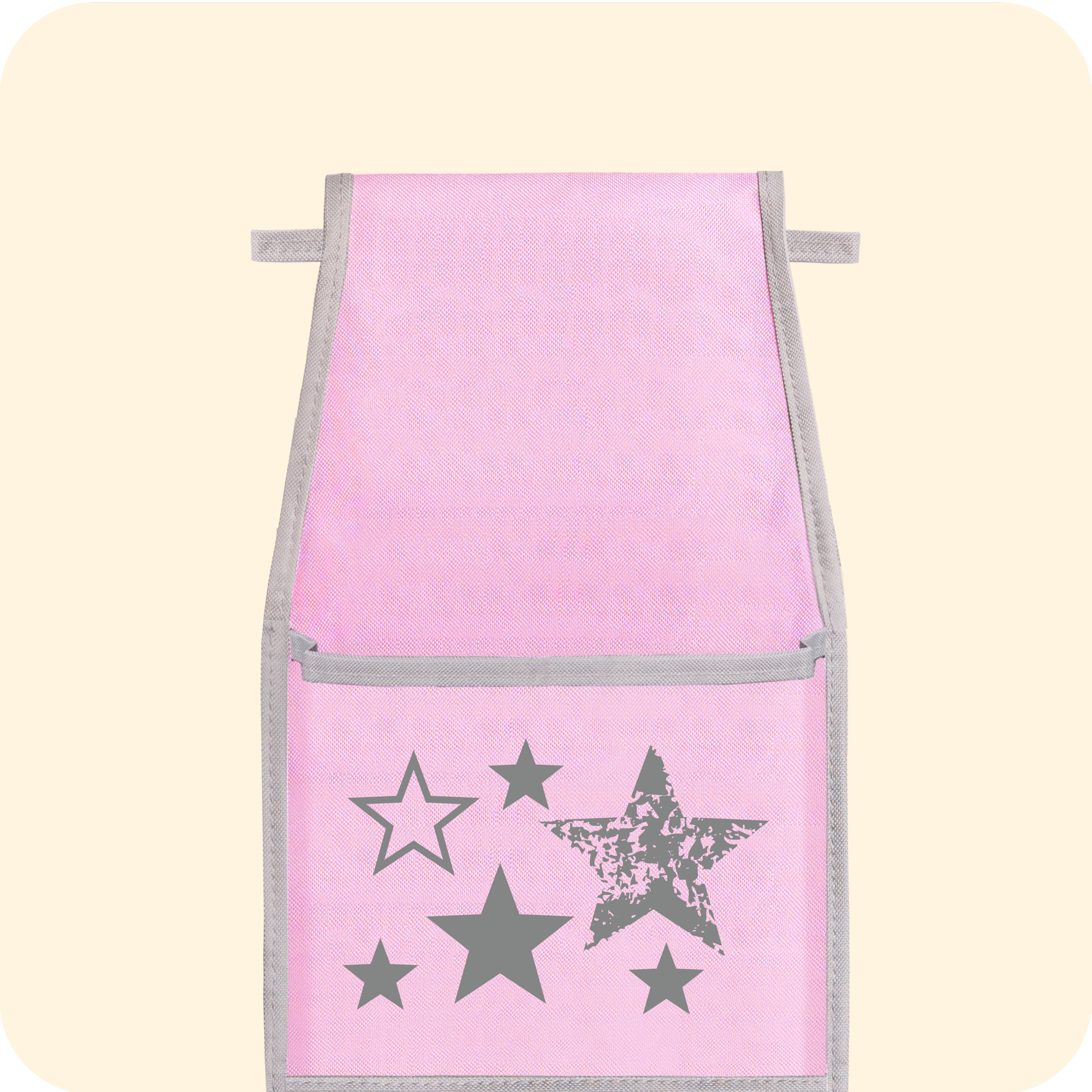 Пять отделений (два тканевых и три прозрачных) вмещают одежду, сменку и аксессуары. Кармашек крепится с помощью перекидного клапана на резинке или петель — можно повесить на крючки (крючки не входят в комплект). Снаружи — прозрачный карман для фото или имени.