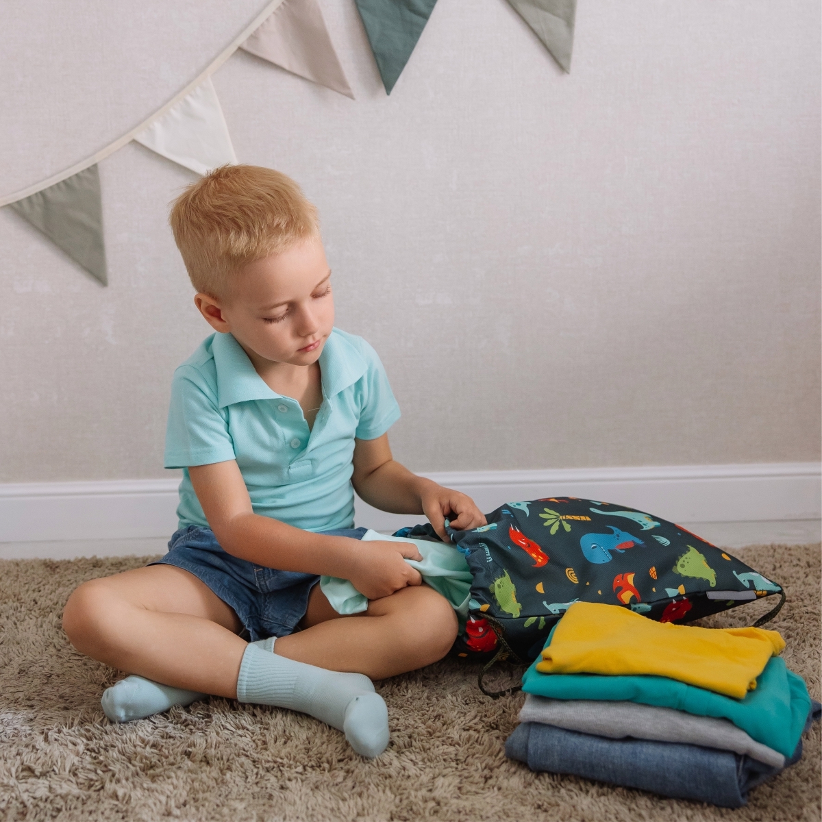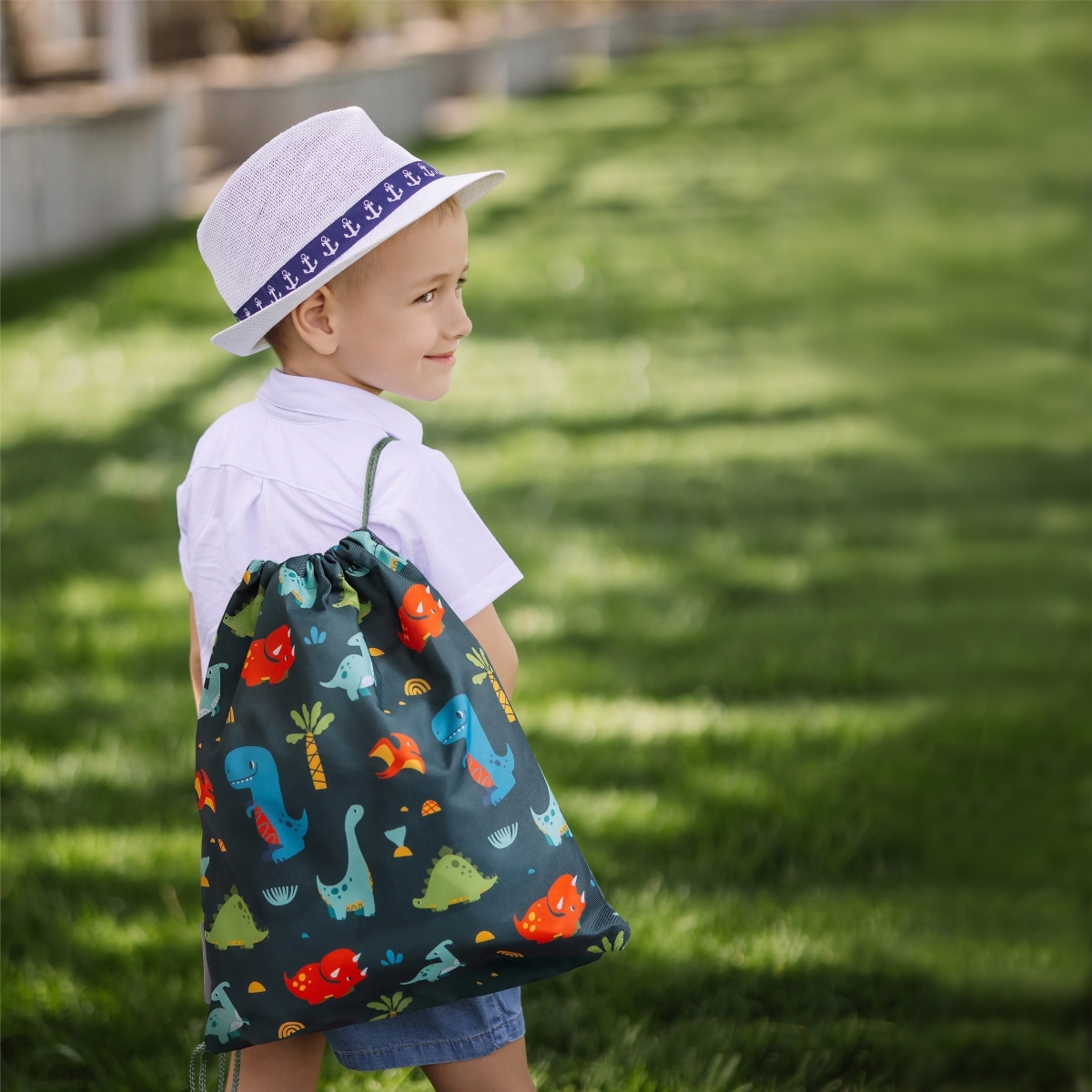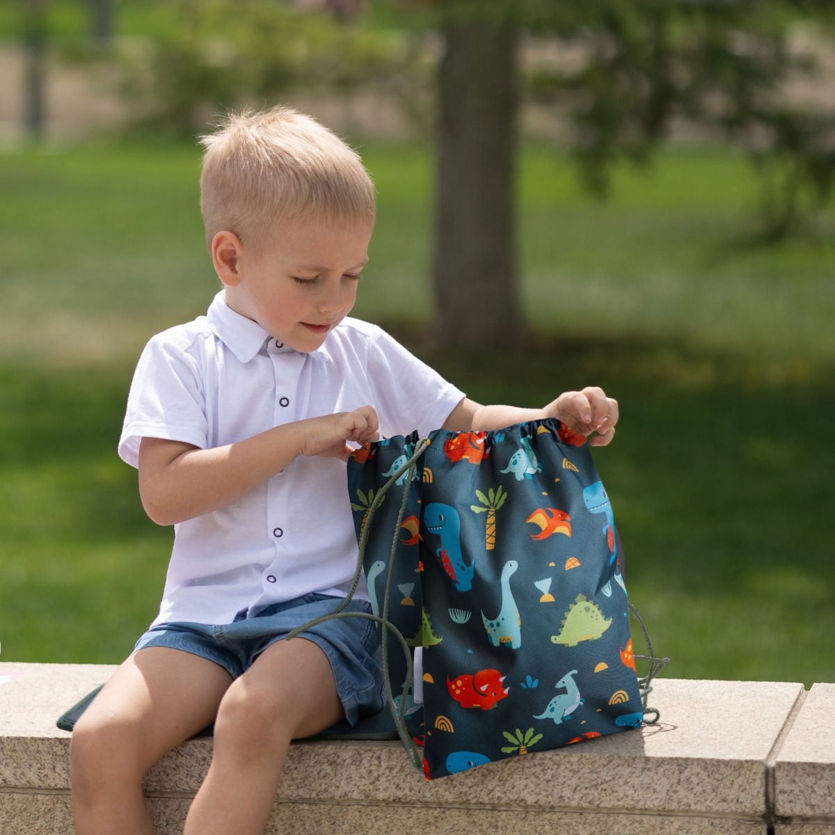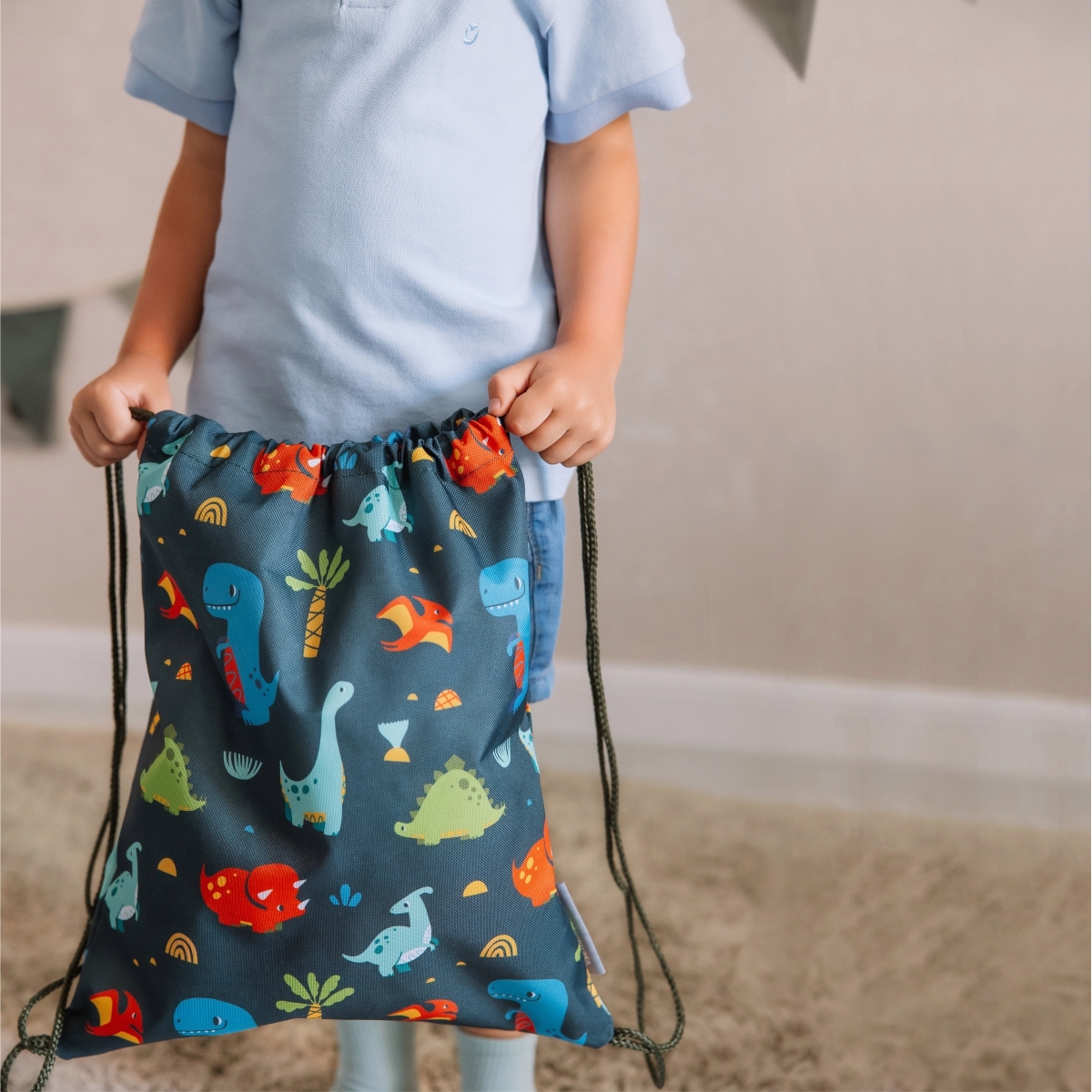 Мешок из прочной ткани Оксфорд вмещает до 10 л, застёгивается на шнуровку и прост в использовании — ребёнок легко справится сам.