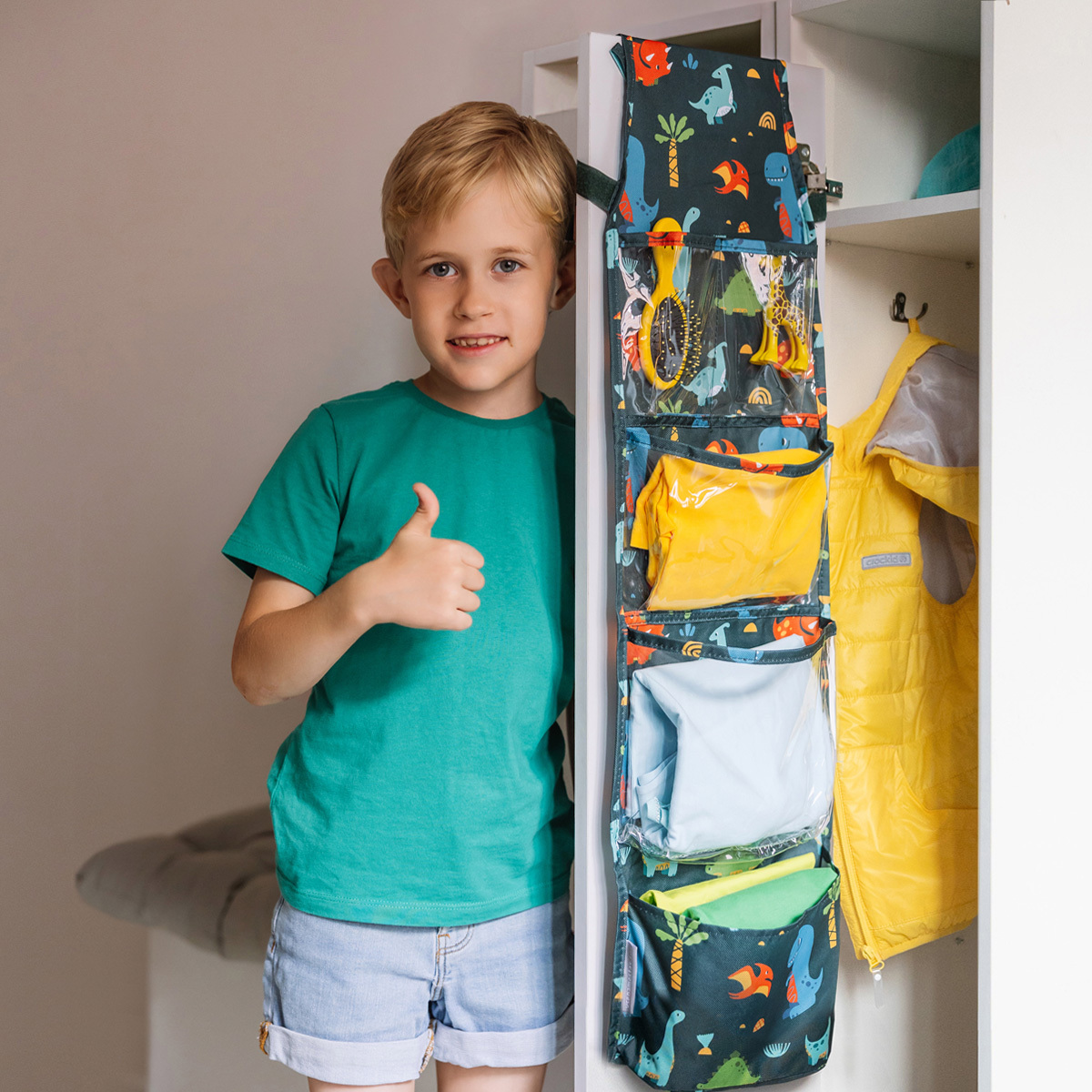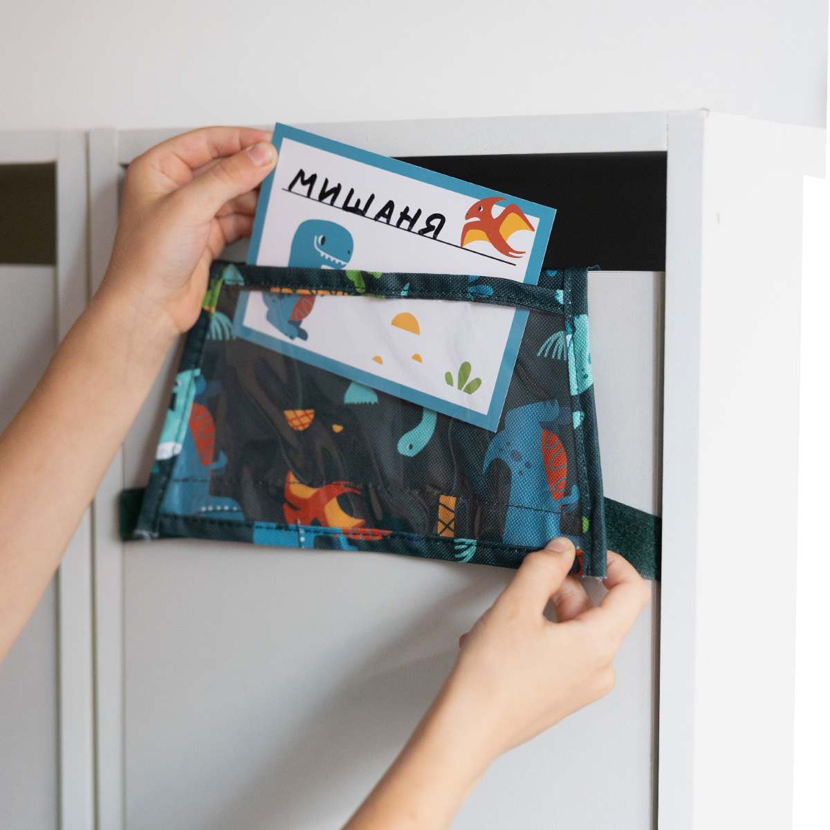 Органайзер помогает аккуратно хранить вещи — 5 вместительных отделений (3 прозрачных и 2 тканевых), внешний карман для фото или имени и два способа крепления: на липучку или петли.