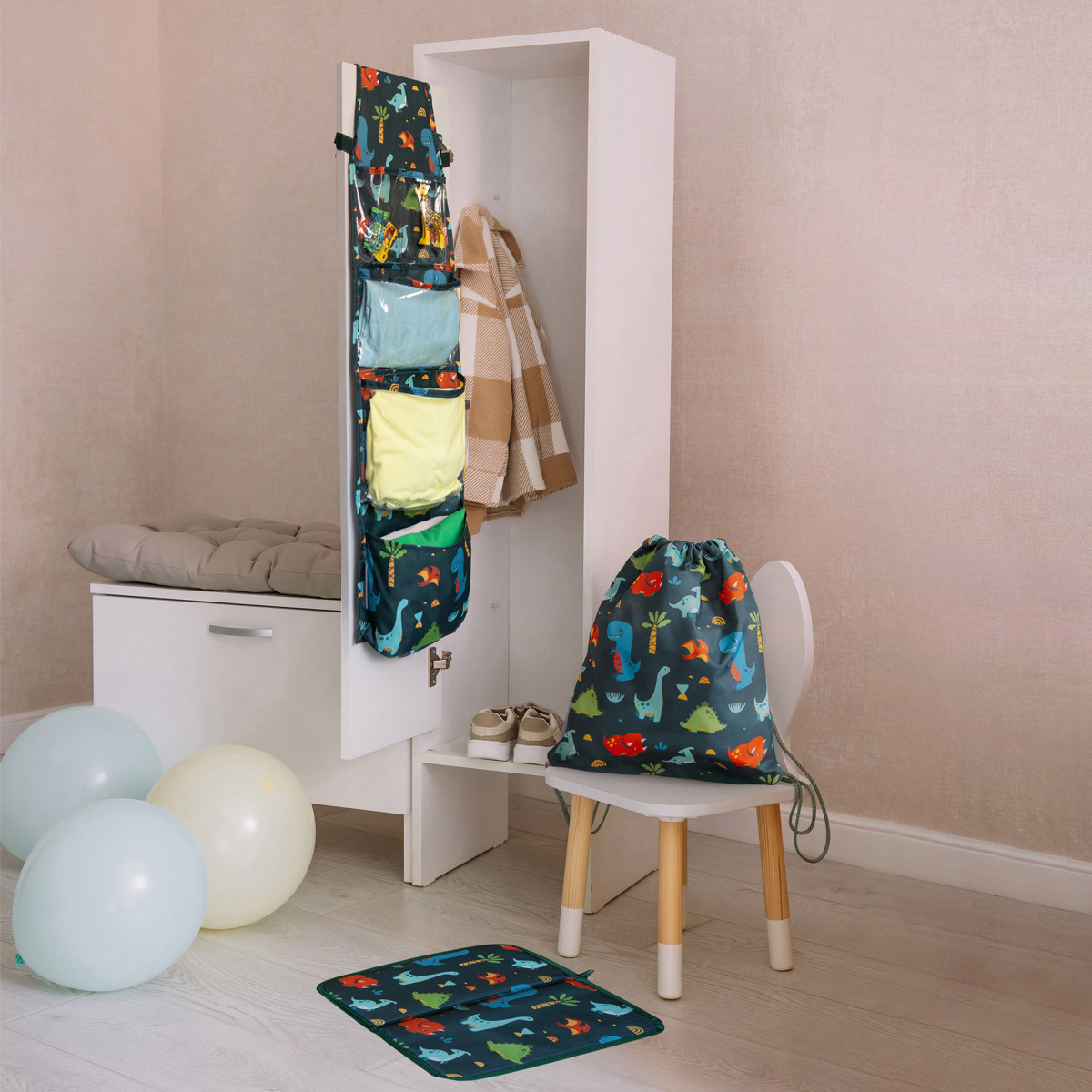 В комплект входят три предмета: органайзер в шкафчик, коврик для переобувания и мешок для сменки.