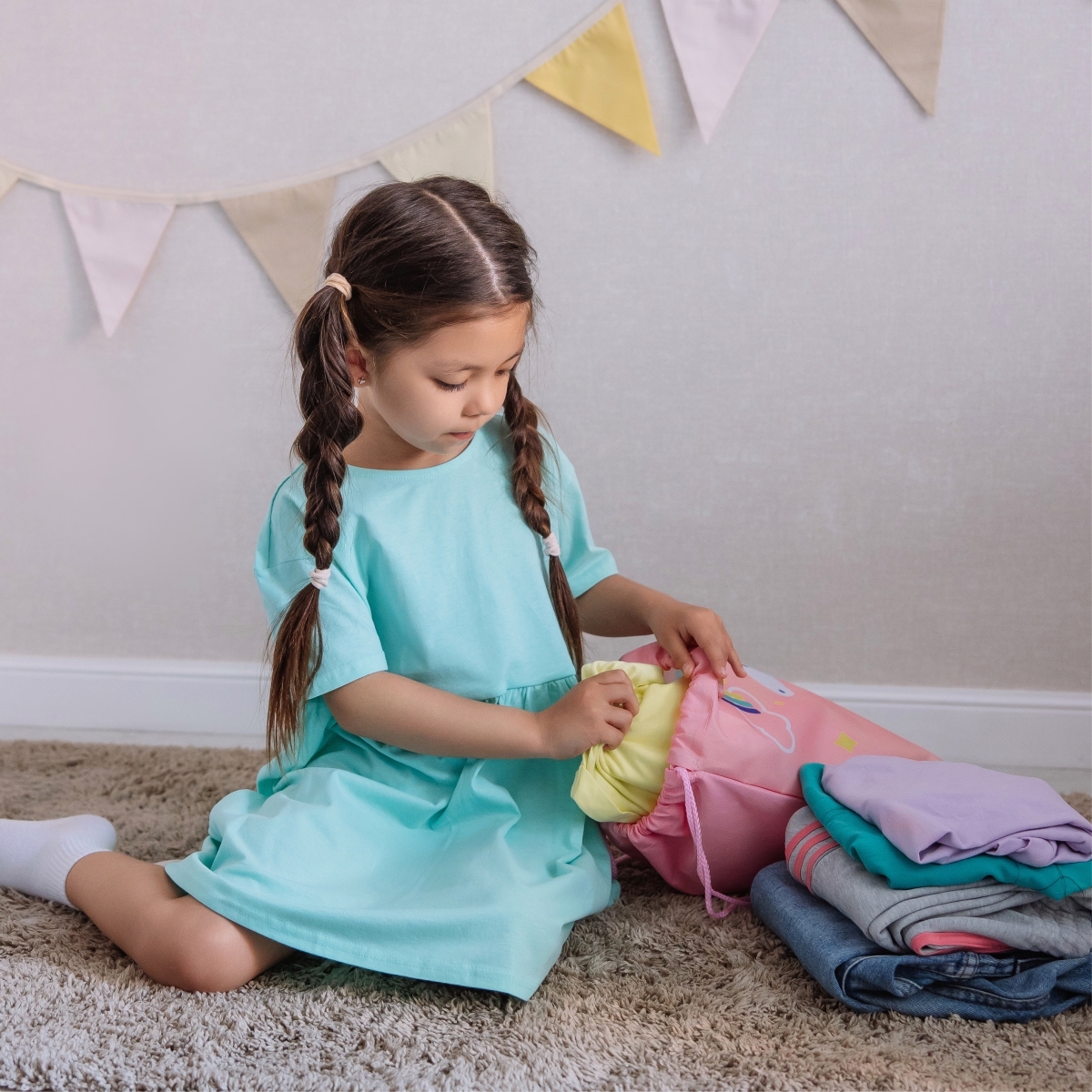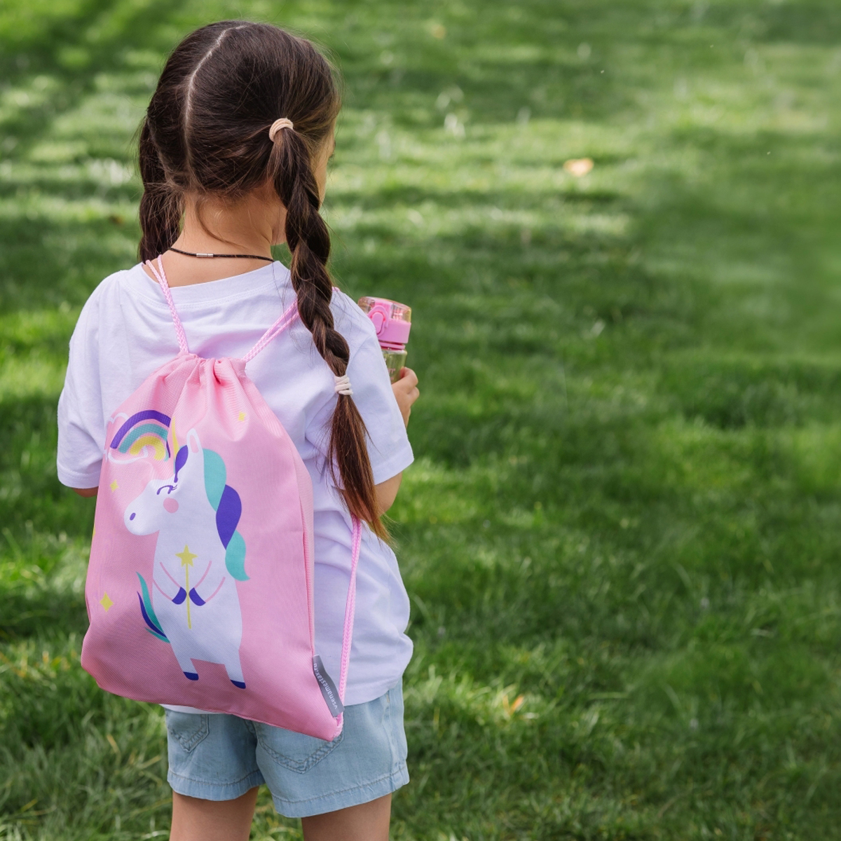 Мешок из прочной ткани вмещает до 10 л, застёгивается на шнуровку и прост в использовании — ребёнок легко справится сам.