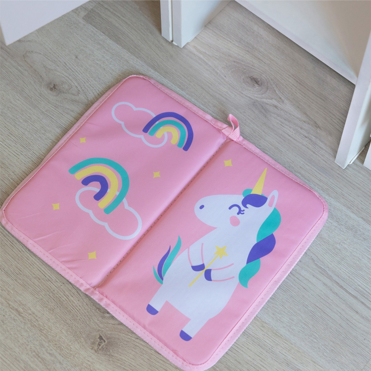 Коврик защищает ножки ребёнка от холода и грязи, не скользит, легко очищается и складывается пополам с помощью магнитной кнопки.