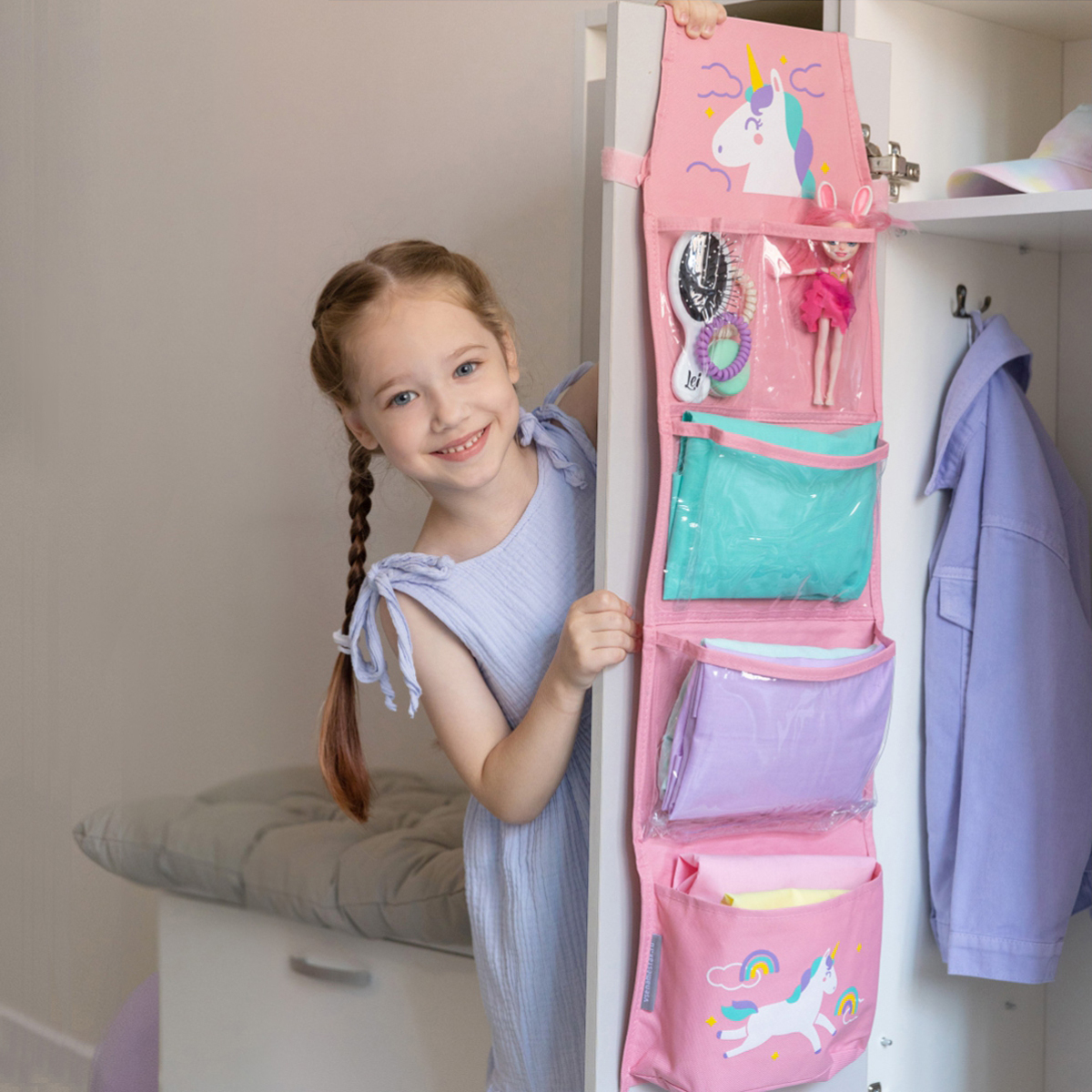 Органайзер помогает аккуратно хранить вещи — 5 вместительных отделений, внешний карман для фото или имени и два способа крепления: на резинку или петли.