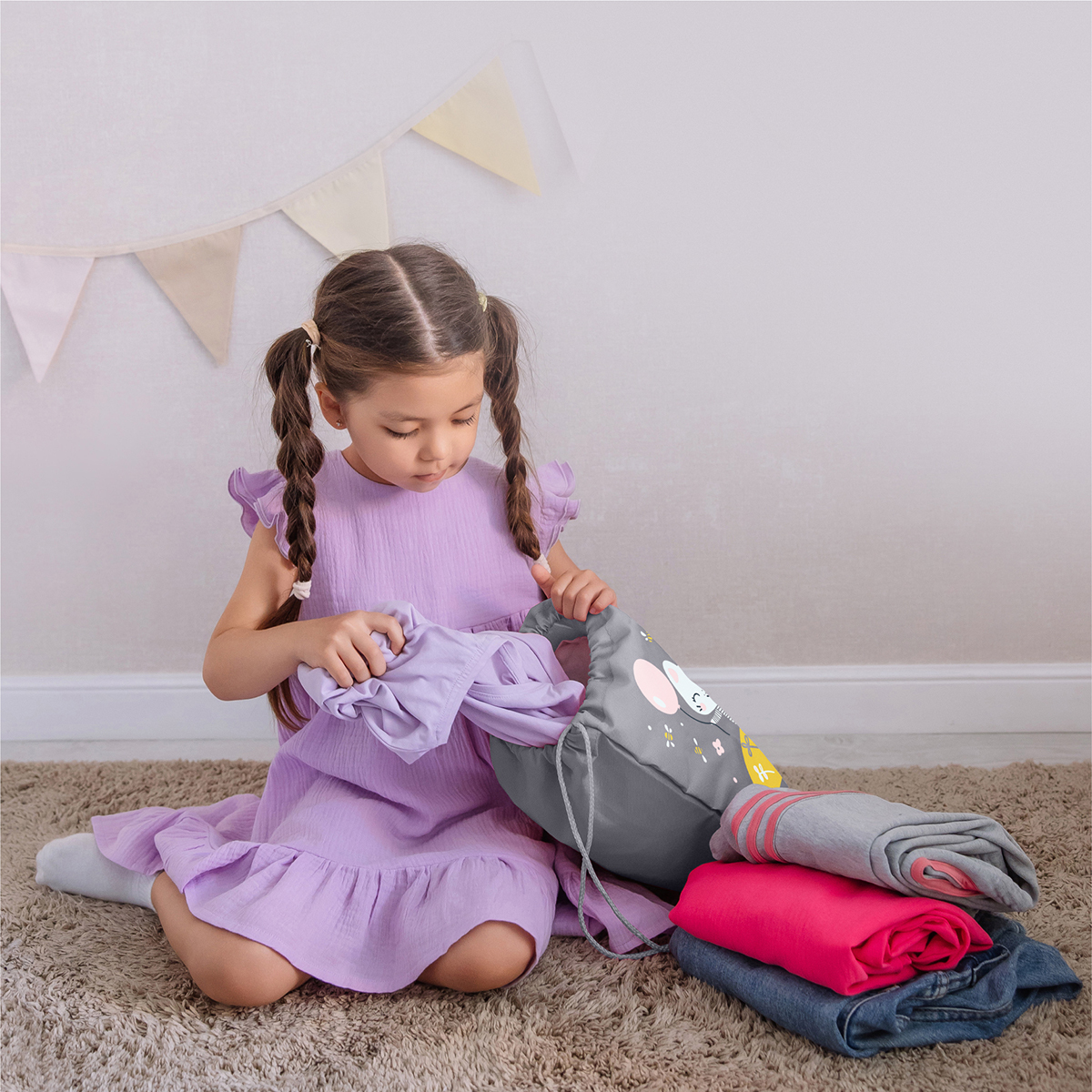 Мешок из прочной ткани Оксфорд 600D вмещает до 10 л, застёгивается на шнуровку и прост в использовании — ребёнок легко справится сам.