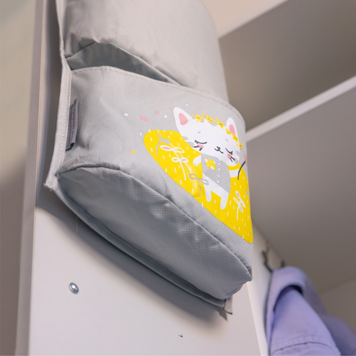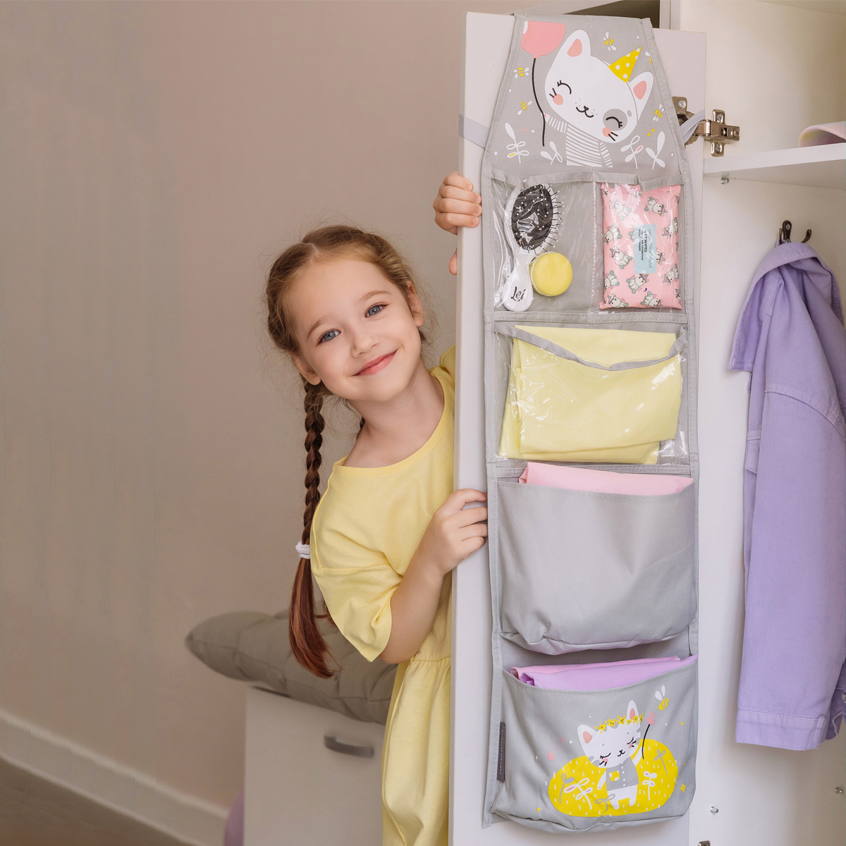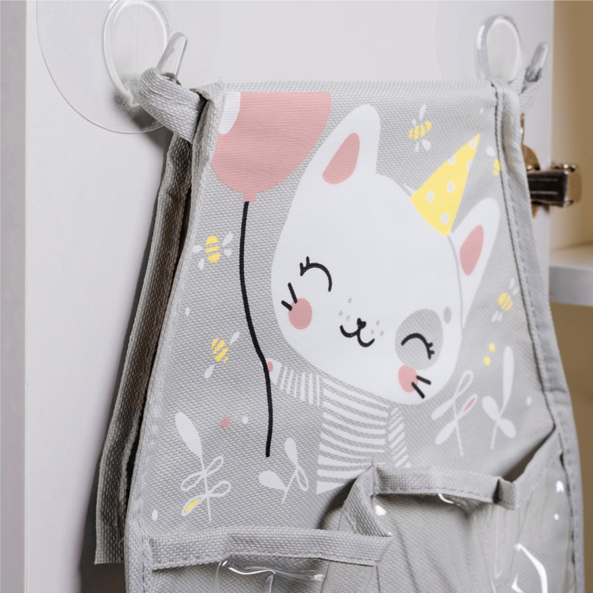 Органайзер помогает аккуратно хранить вещи — 5 вместительных отделений (3 прозрачных и 2 тканевых), внешний карман для фото или имени и два способа крепления: на резинку или петли.
