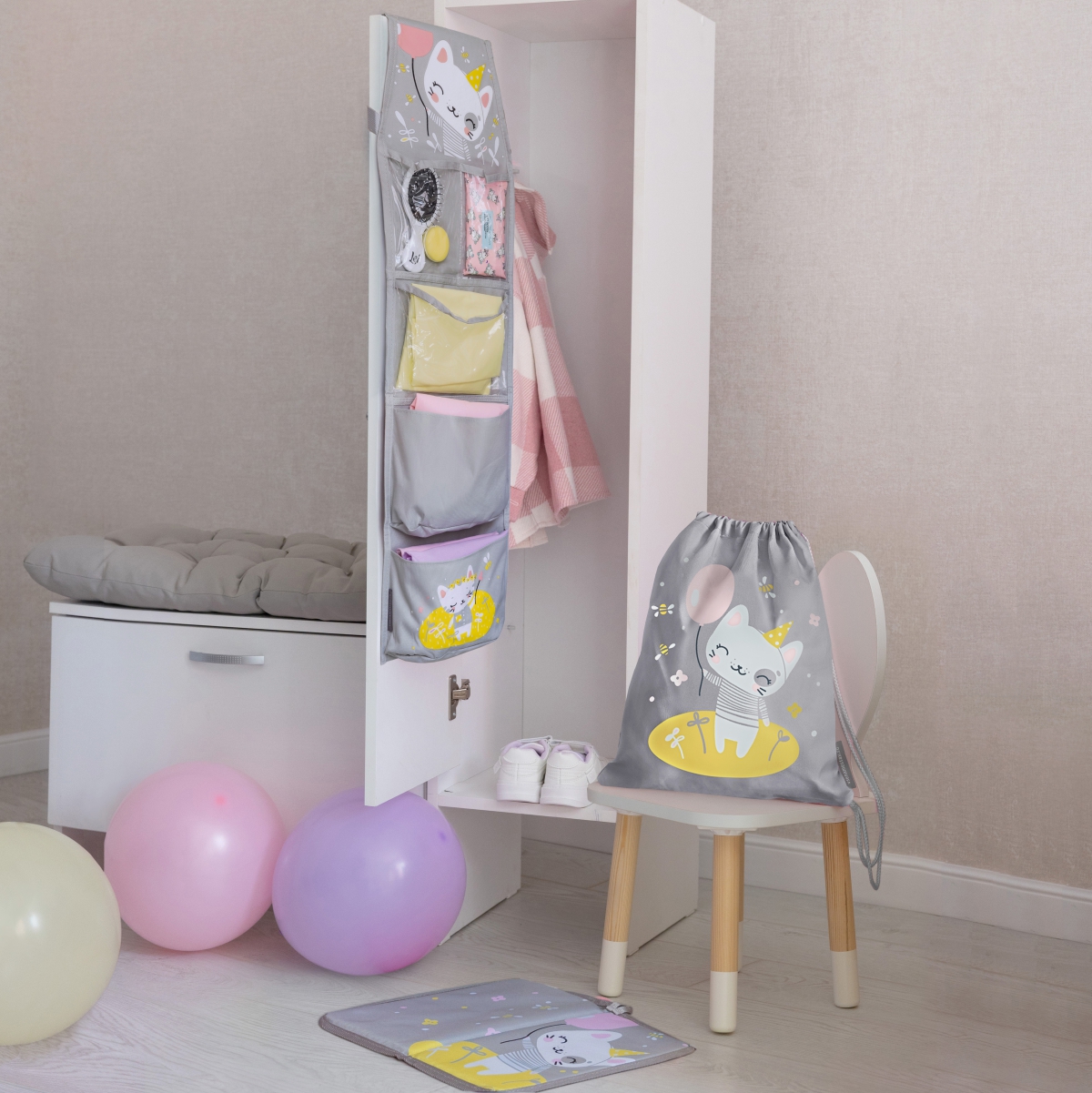 В комплект входят три предмета: органайзер в шкафчик, коврик для переобувания и мешок для сменки.