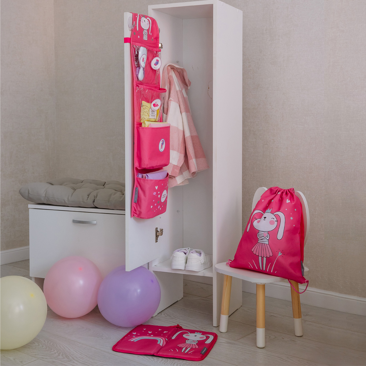 В комплект входят три предмета: органайзер в шкафчик, коврик для переобувания и мешок для сменки.