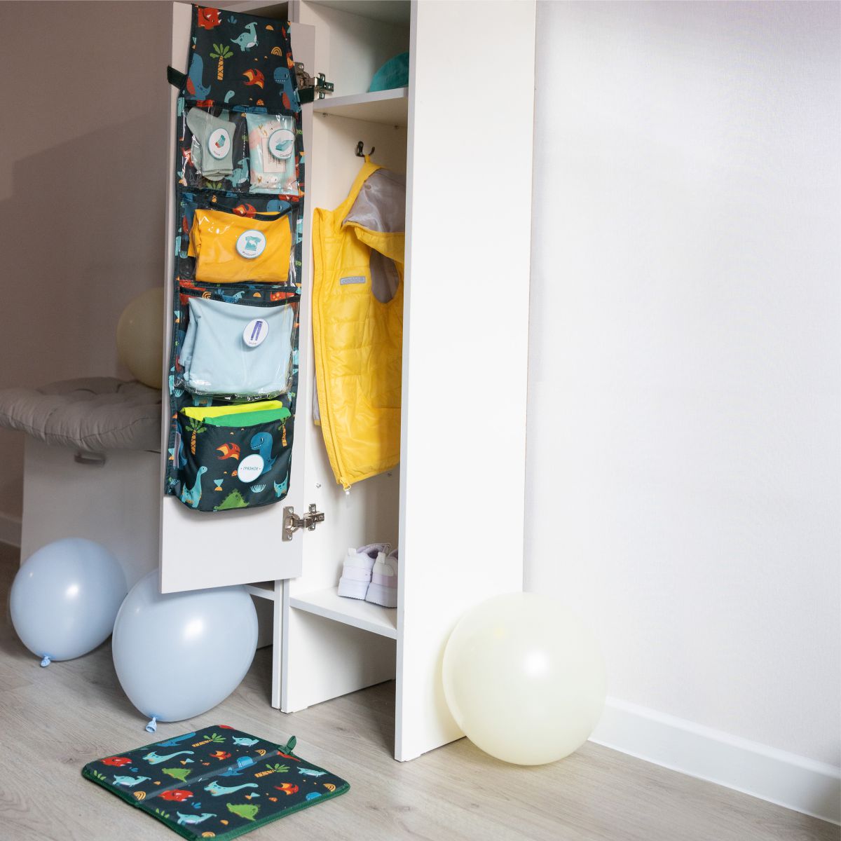 Набор для детского сада «Всё на местах» — всё, чтобы собрать ребёнка в садик с комфортом. В комплект входят три полезных предмета: органайзер в шкафчик, коврик для переобувания и наклейки для обозначения одежды.