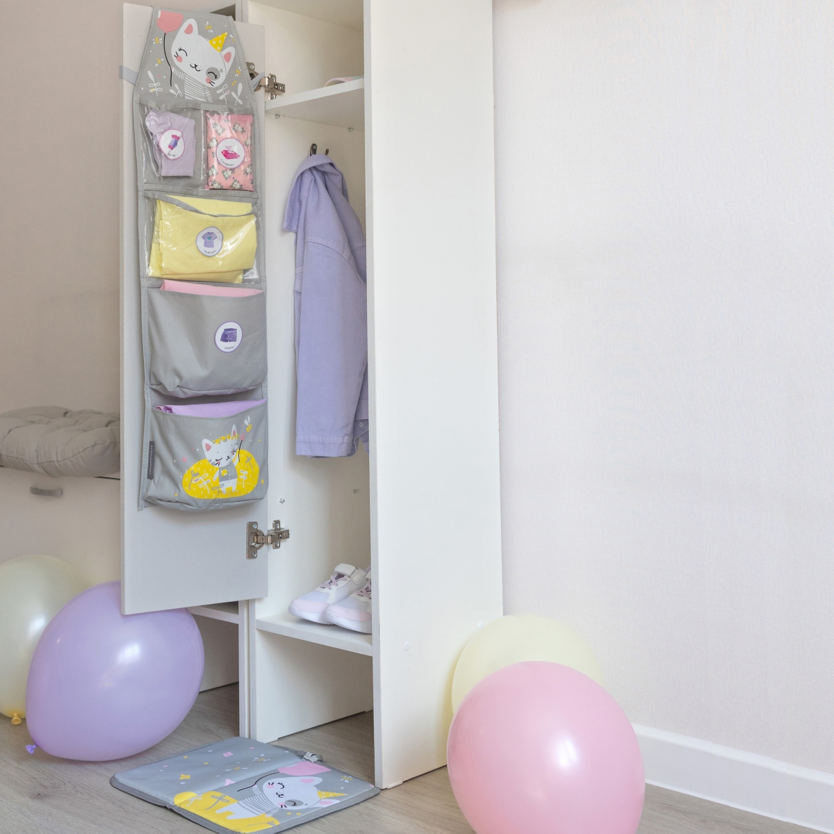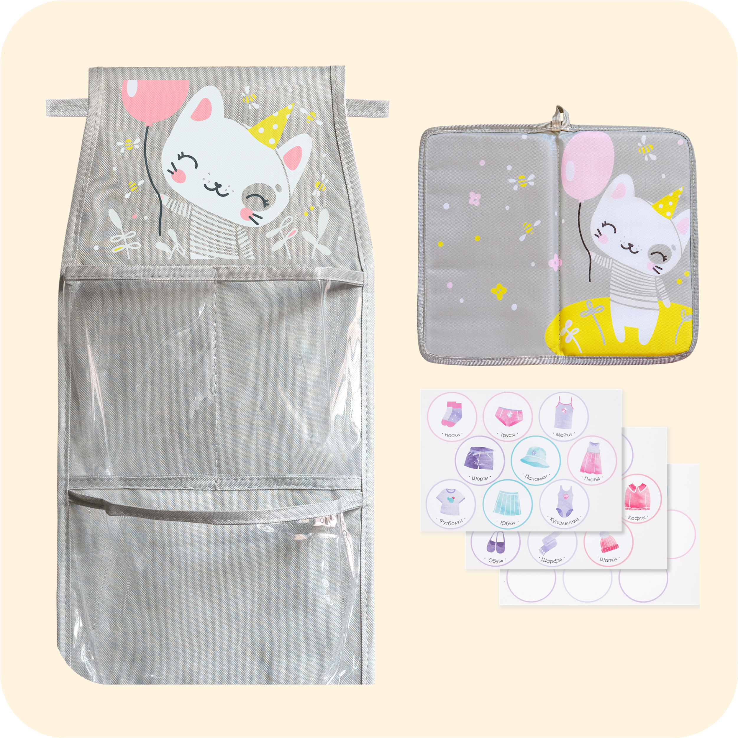 Набор для детского сада «Всё на местах» — всё, чтобы собрать ребёнка в садик с комфортом. В комплект входят три полезных предмета: органайзер в шкафчик, коврик для переобувания и наклейки для обозначения одежды.