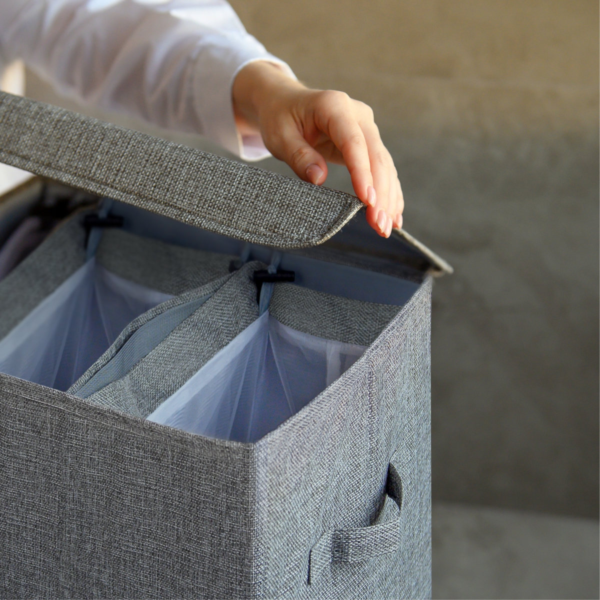 Внутри — три отделения для раздельного сбора вещей, одно из которых выполнено в виде отдельного мешка: его можно достать и отправить прямо в стирку. Плотные стенки с пластиковыми вставками держат форму, а крышка на магните закрывается мягко, не цепляя одежду. Корзина выполнена из дышащего льняного материала, легко складывается и занимает минимум места при хранении.