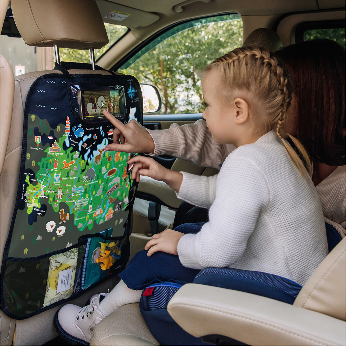 Органайзер на спинку сиденья защитит обивку от грязи, пыли и следов от детских ботинок. Подходит для большинства автомобилей, крепится на липучку и резинку, плотно прилегает и не сползает. Прозрачный карман с сенсорной плёнкой позволяет смотреть мультики, не доставая телефон, а дополнительные отделения помогают держать вещи под рукой.